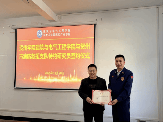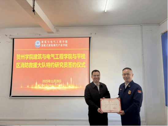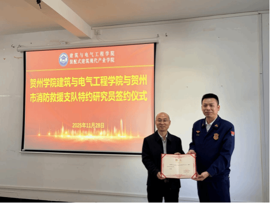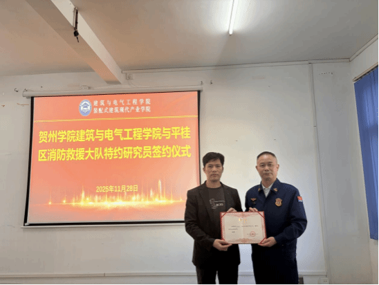 2025年11月28日,贺州市消防救援支队副支队长吴远栋、平桂区消防救援大队队长林必伟率队莅临建筑与电气工程学院,在学院311会议室成功举行合作座谈会暨特约研究员签约聘任仪式。学校教务处处长陈宜虎,学院党委书记黄鼎玉,副院长(主持工作)许胜才、李和旺,贺州民族文化博物馆马小骅及骨干教师出席会议。