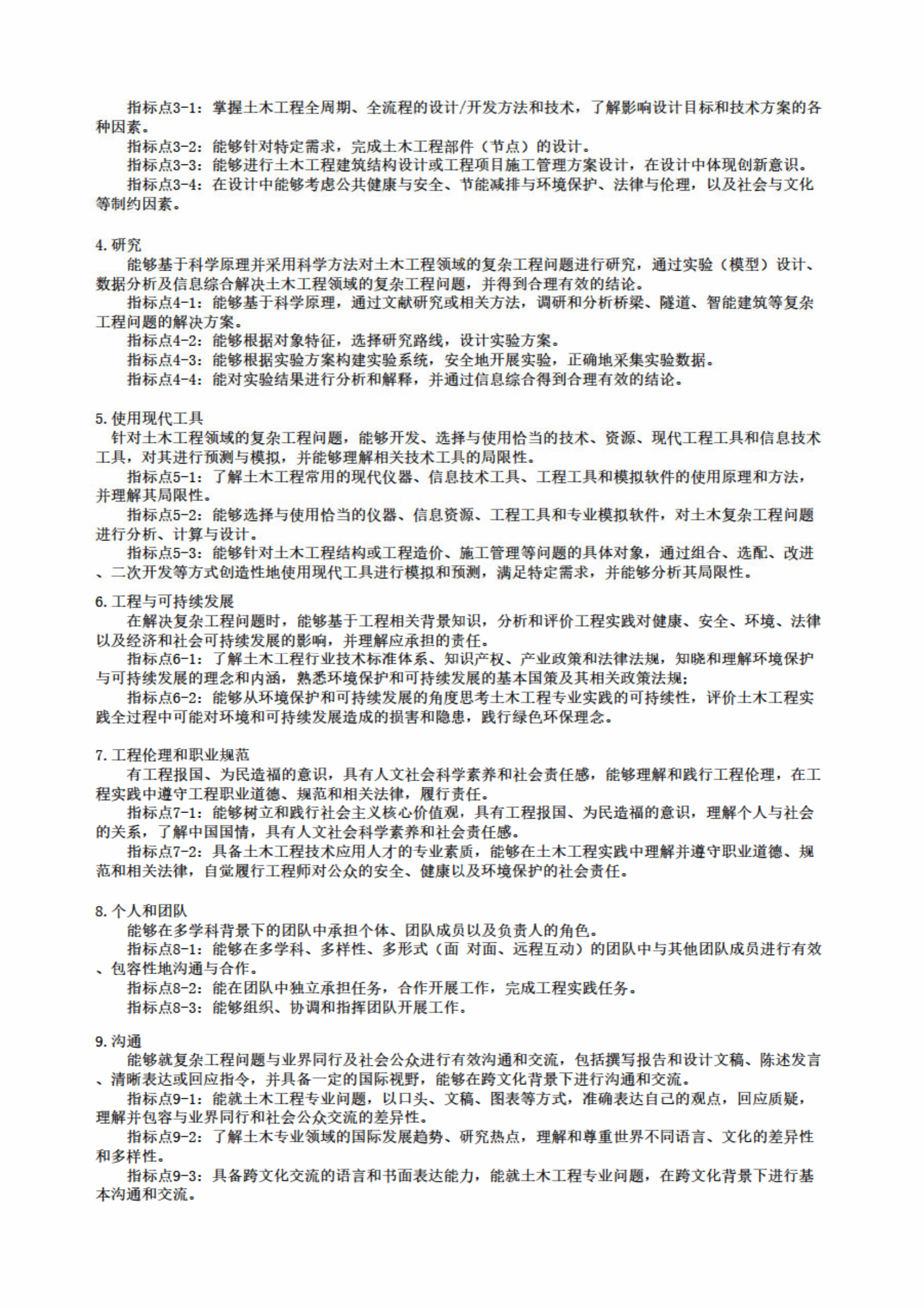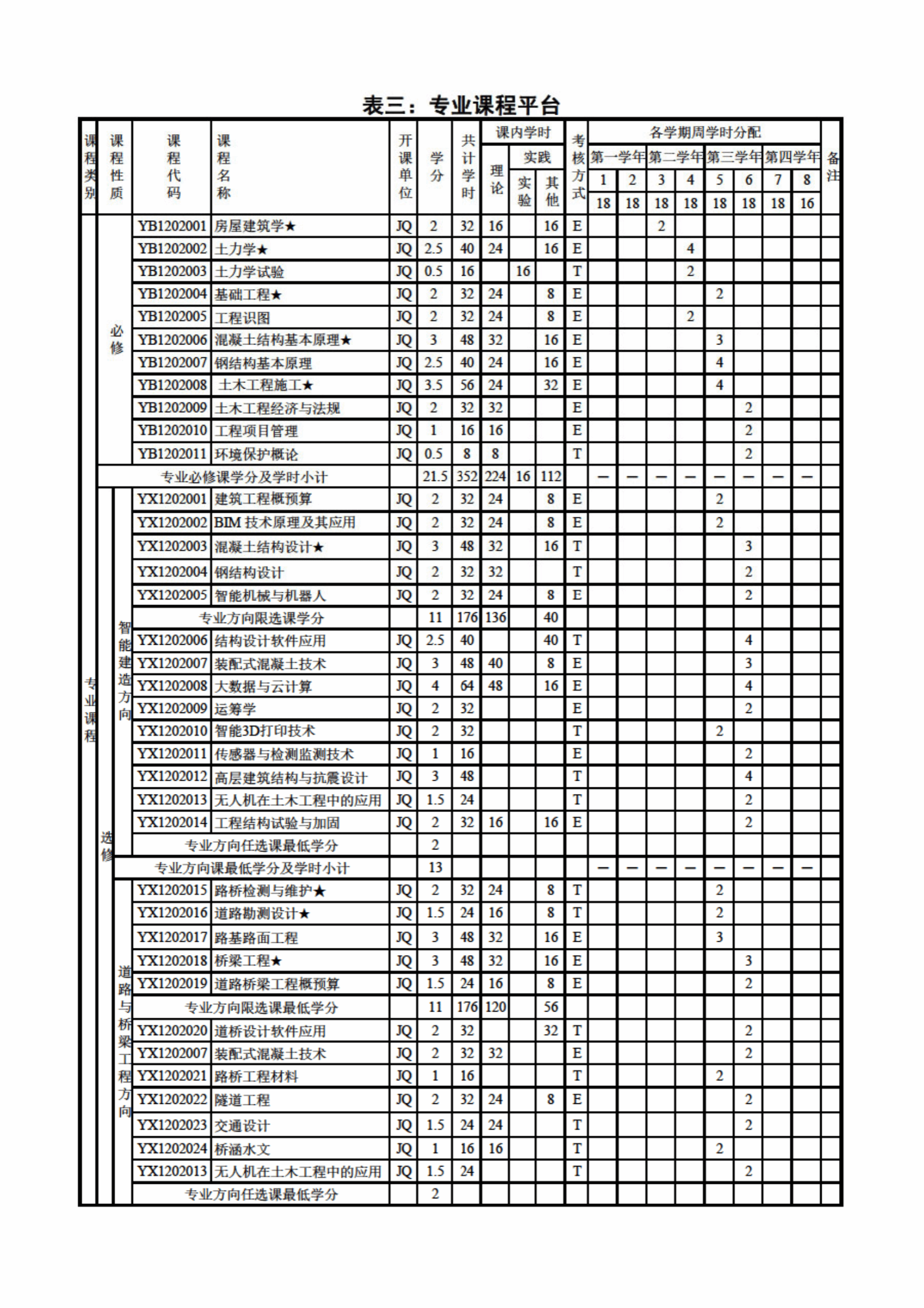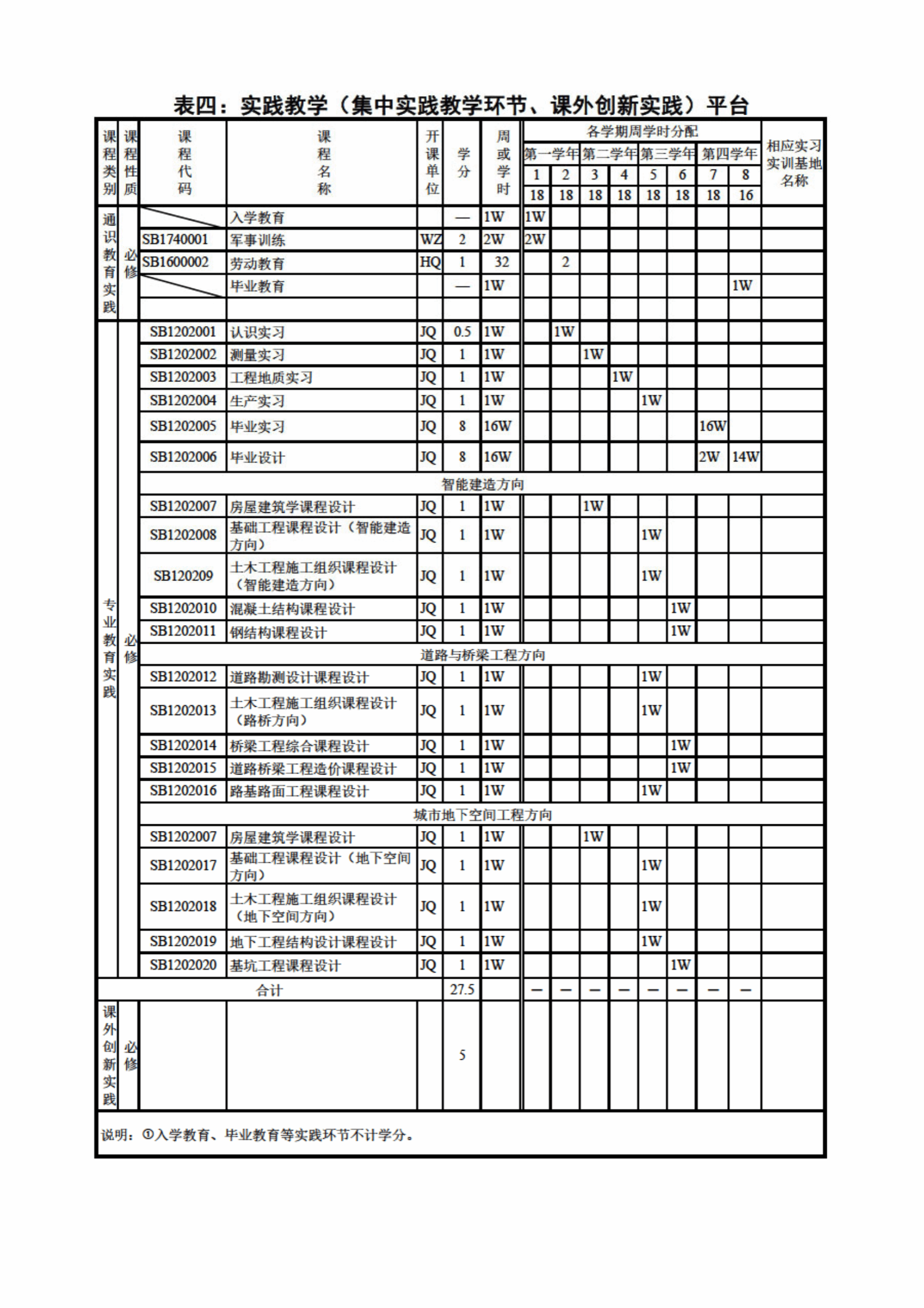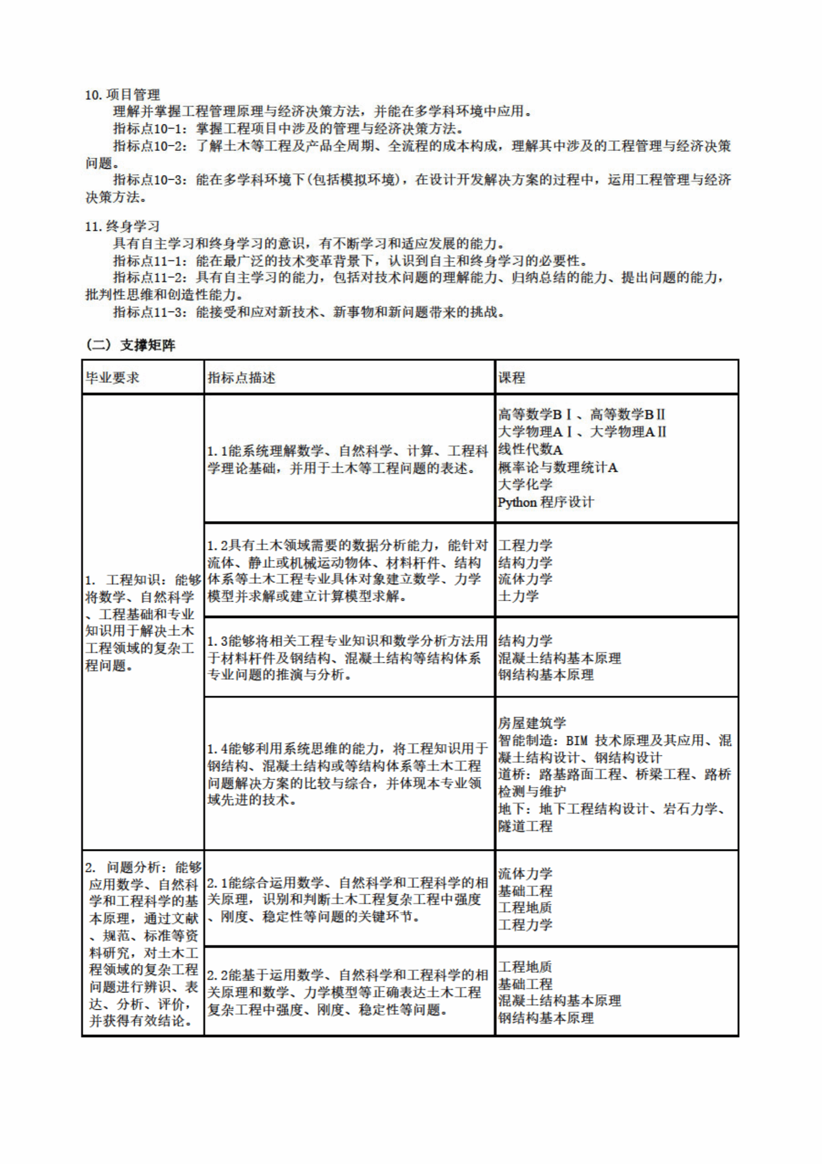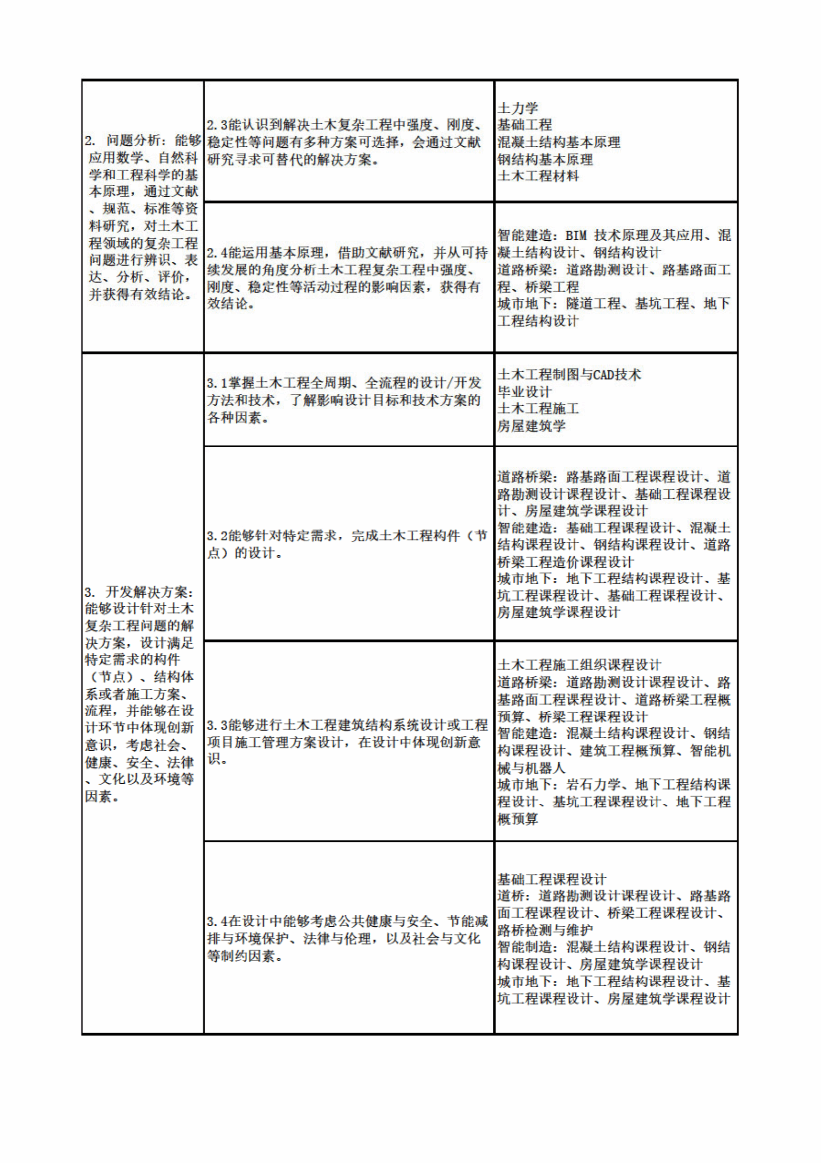 3.培养目标:本专业培养德、智、体、美、劳全面发展的社会主义事业合格建设者和可靠接班人;培养掌握土木工程学科基础理论、专业知识和实践技能,具备工程结构设计、施工技术管理、工程经济分析及创新应用能力,能够在房屋建筑、道路桥梁、岩土工程、市政设施等领域从事勘察、设计、施工、监理、检测、项目管理等工作,适应行业技术发展需求的高素质应用型人才。