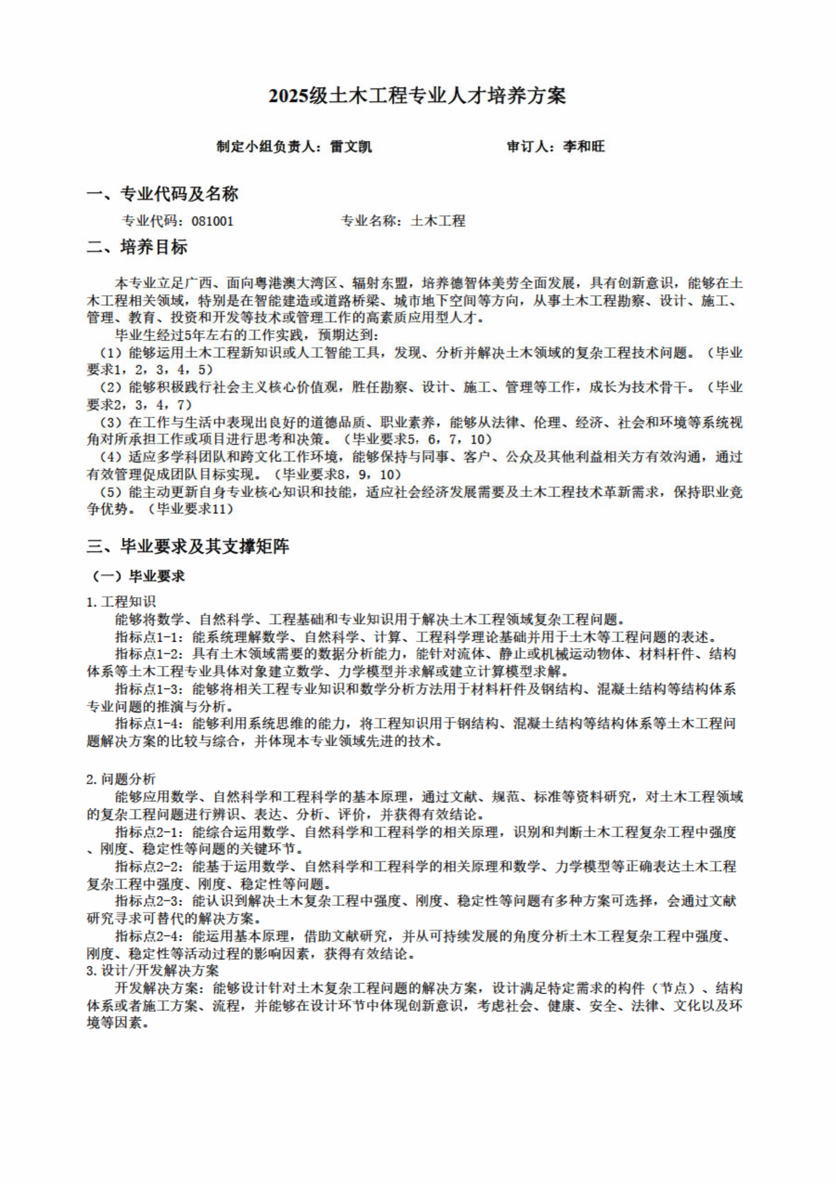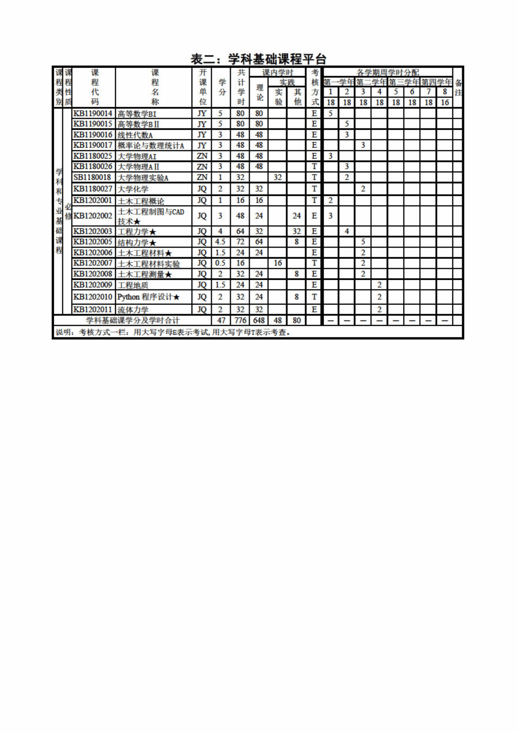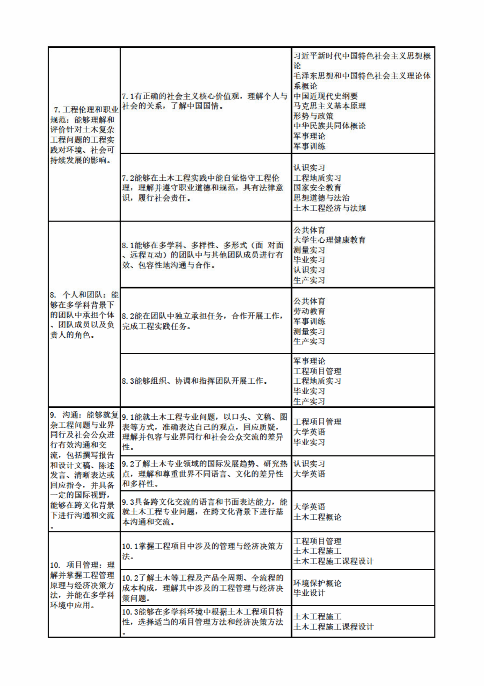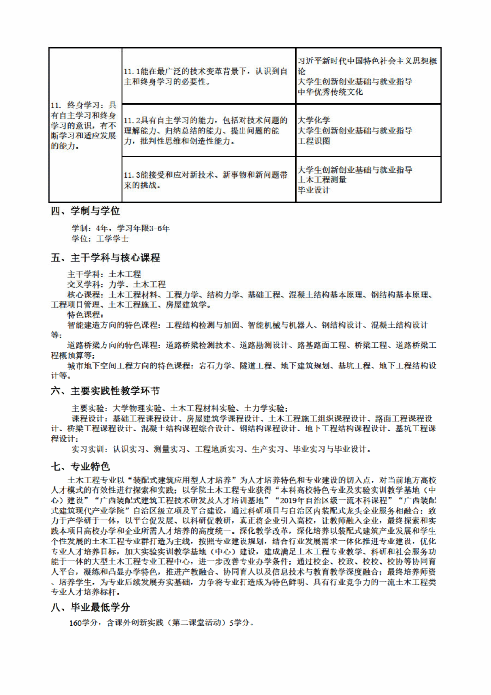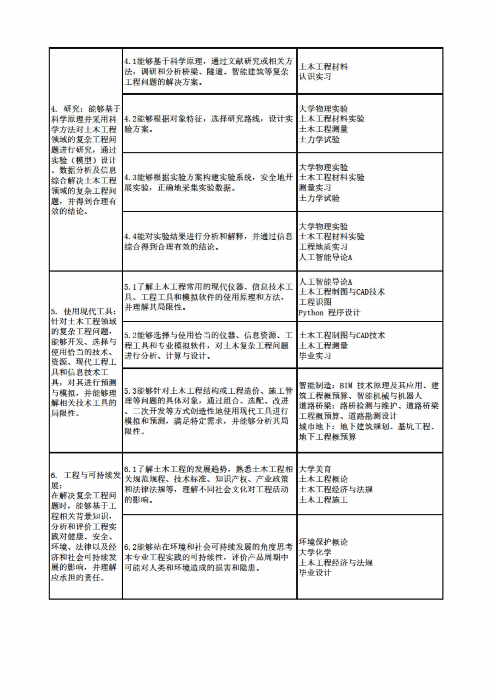 3.培养目标:本专业培养德、智、体、美、劳全面发展的社会主义事业合格建设者和可靠接班人;培养掌握土木工程学科基础理论、专业知识和实践技能,具备工程结构设计、施工技术管理、工程经济分析及创新应用能力,能够在房屋建筑、道路桥梁、岩土工程、市政设施等领域从事勘察、设计、施工、监理、检测、项目管理等工作,适应行业技术发展需求的高素质应用型人才。