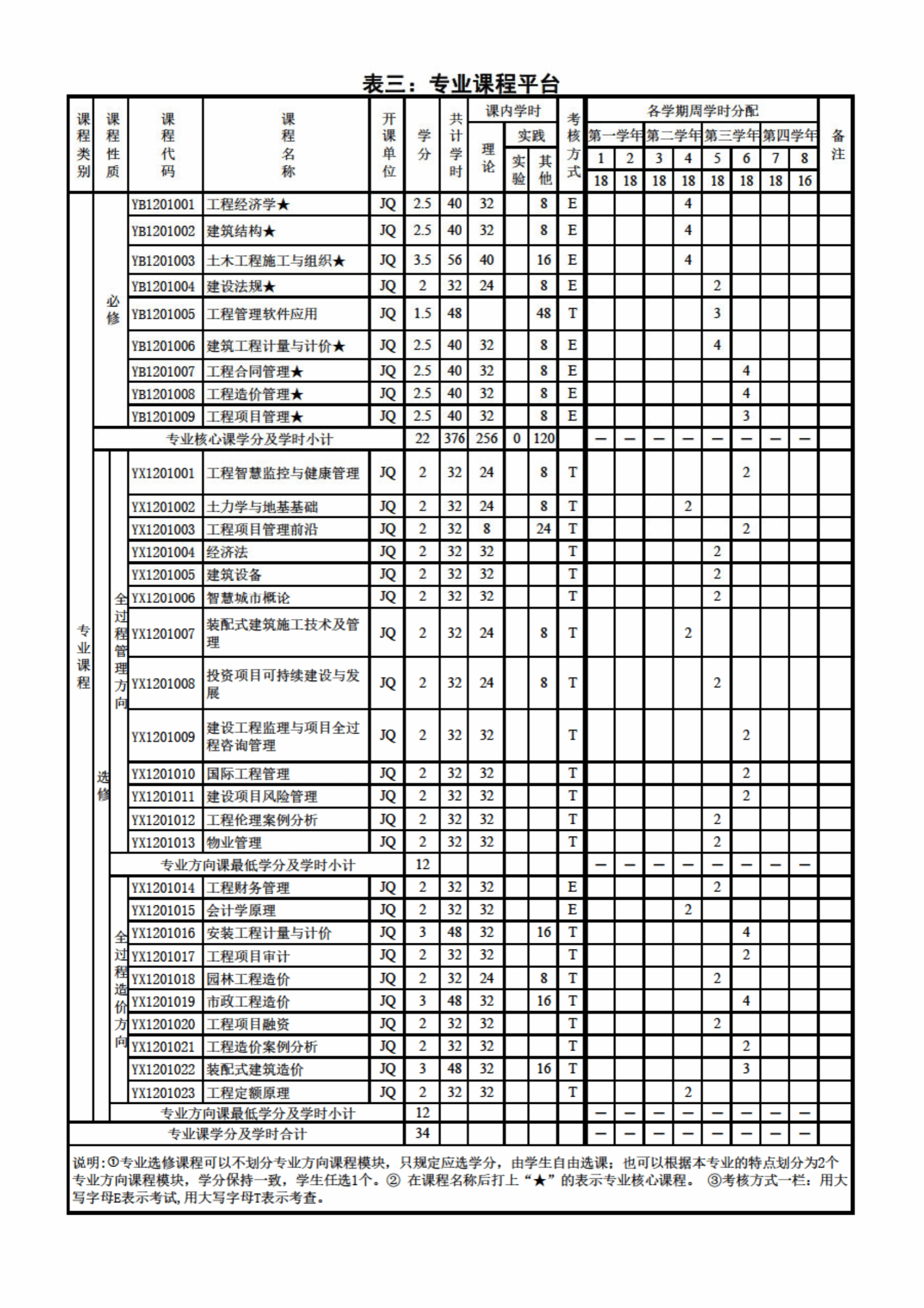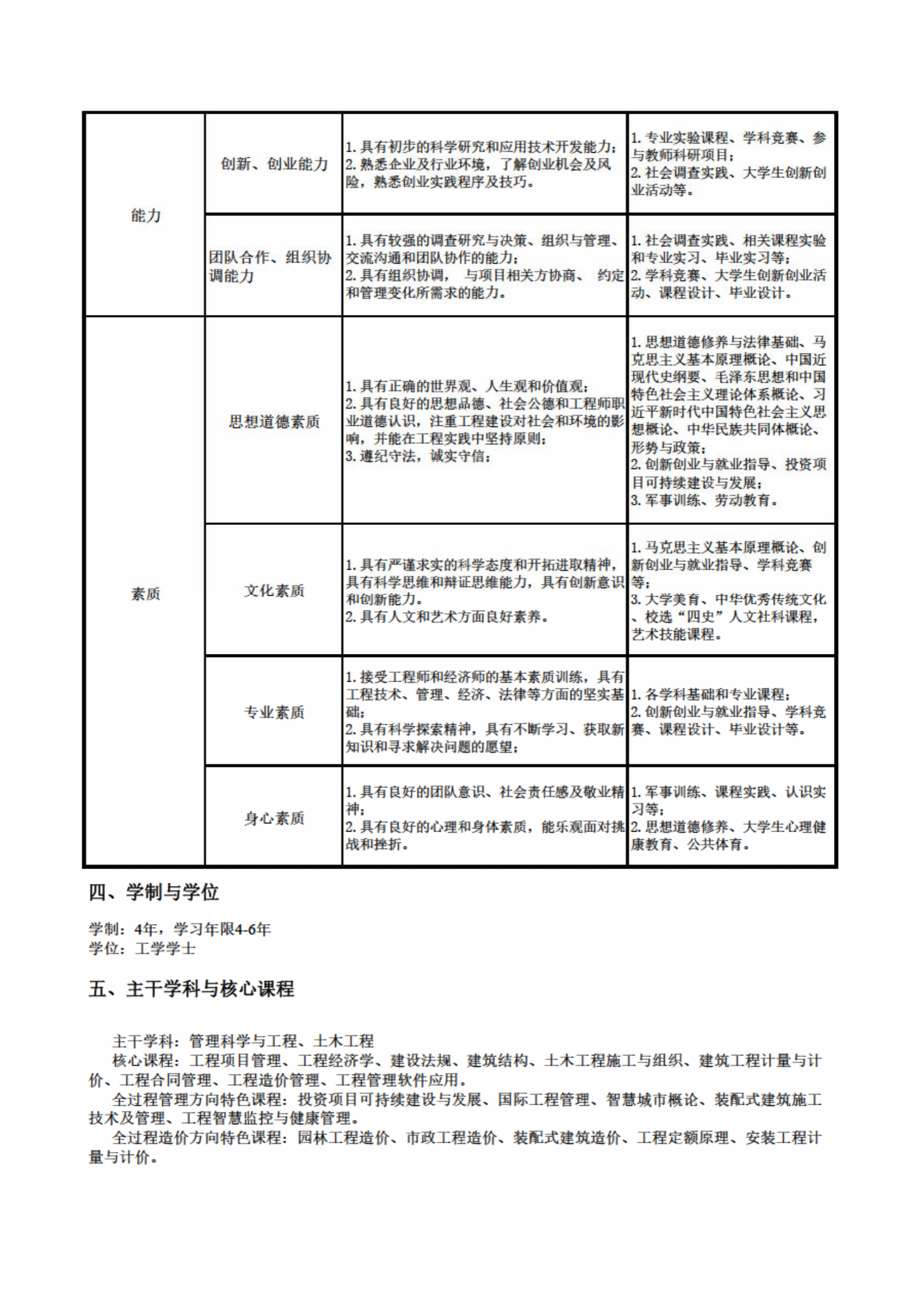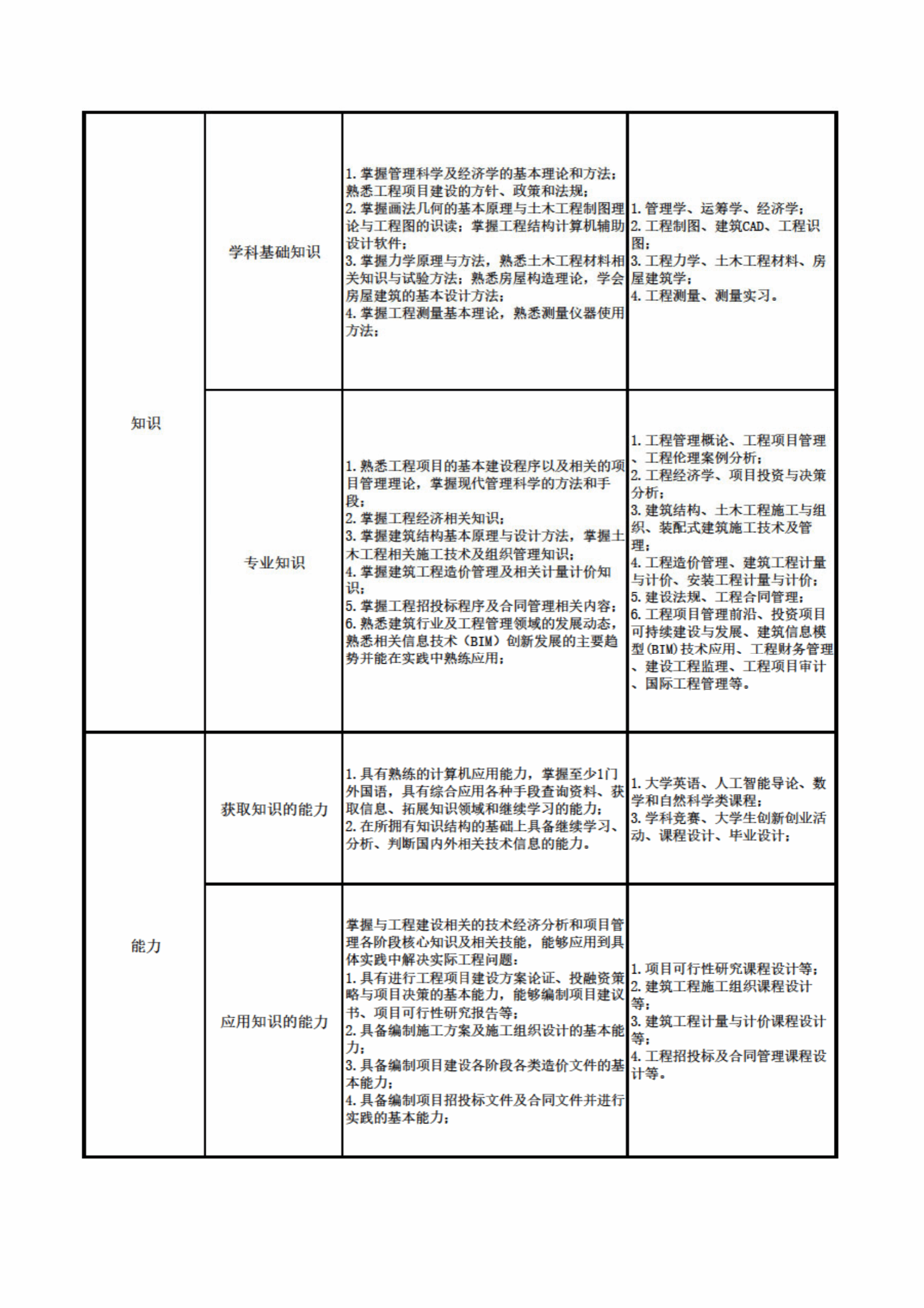3.培养目标:本专业贯彻党的教育方针,落实立德树人根本任务,坚持用核心价值观涵养大学生;树立“学生中心、产出导向、持续改进”办学理念,秉承“实基础、宽口径、强能力、重实践”培养定位,培养德智体美劳全面发展的社会主义建设者和接班人。学生毕业时需掌握土木工程建设领域的专业知识以及管理学、经济学、法律法规等多门交叉学科相应的基础理论和基本技能,具有良好的实践能力和创新精神、终身持续学习的良好习惯等,并能依托建筑信息模型(BIM)等现代化信息技术管理手段,在工程建设领域的企事业单位、相关政府部门从事建设项目全过程管理中的投资决策、勘察设计、施工及监理(项目管理)、造价咨询、工程审计等方面管理工作的高素质应用型人才。
