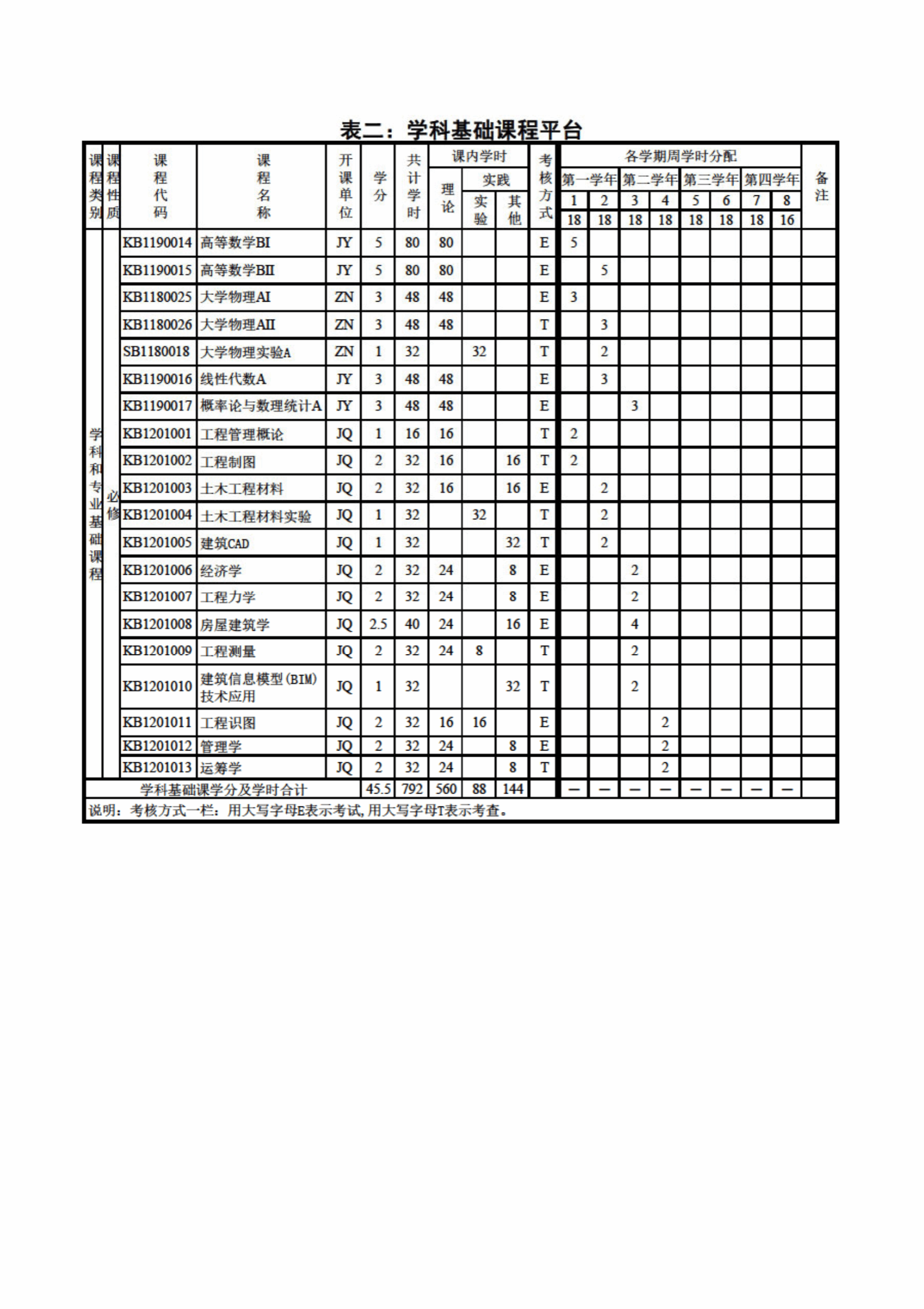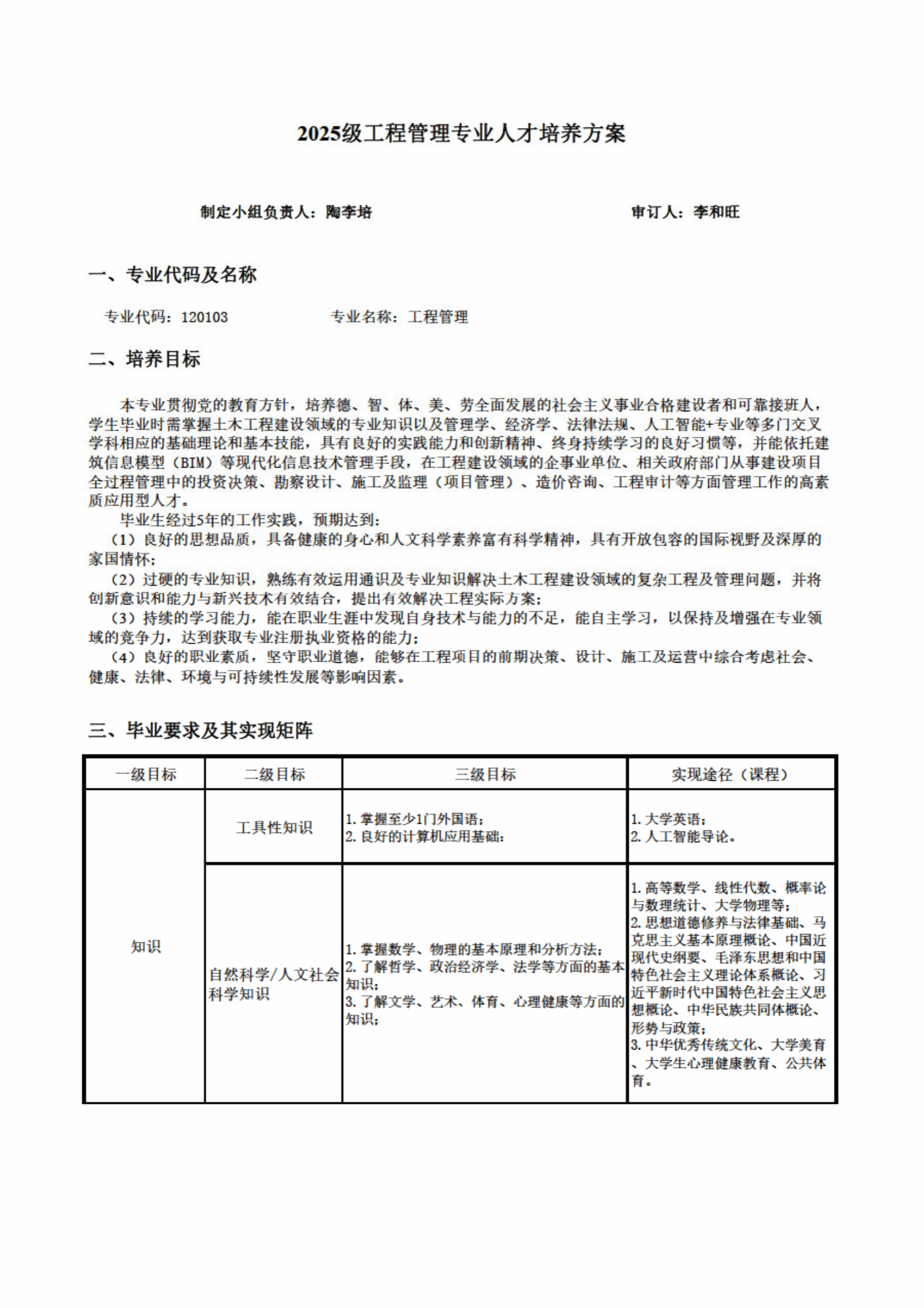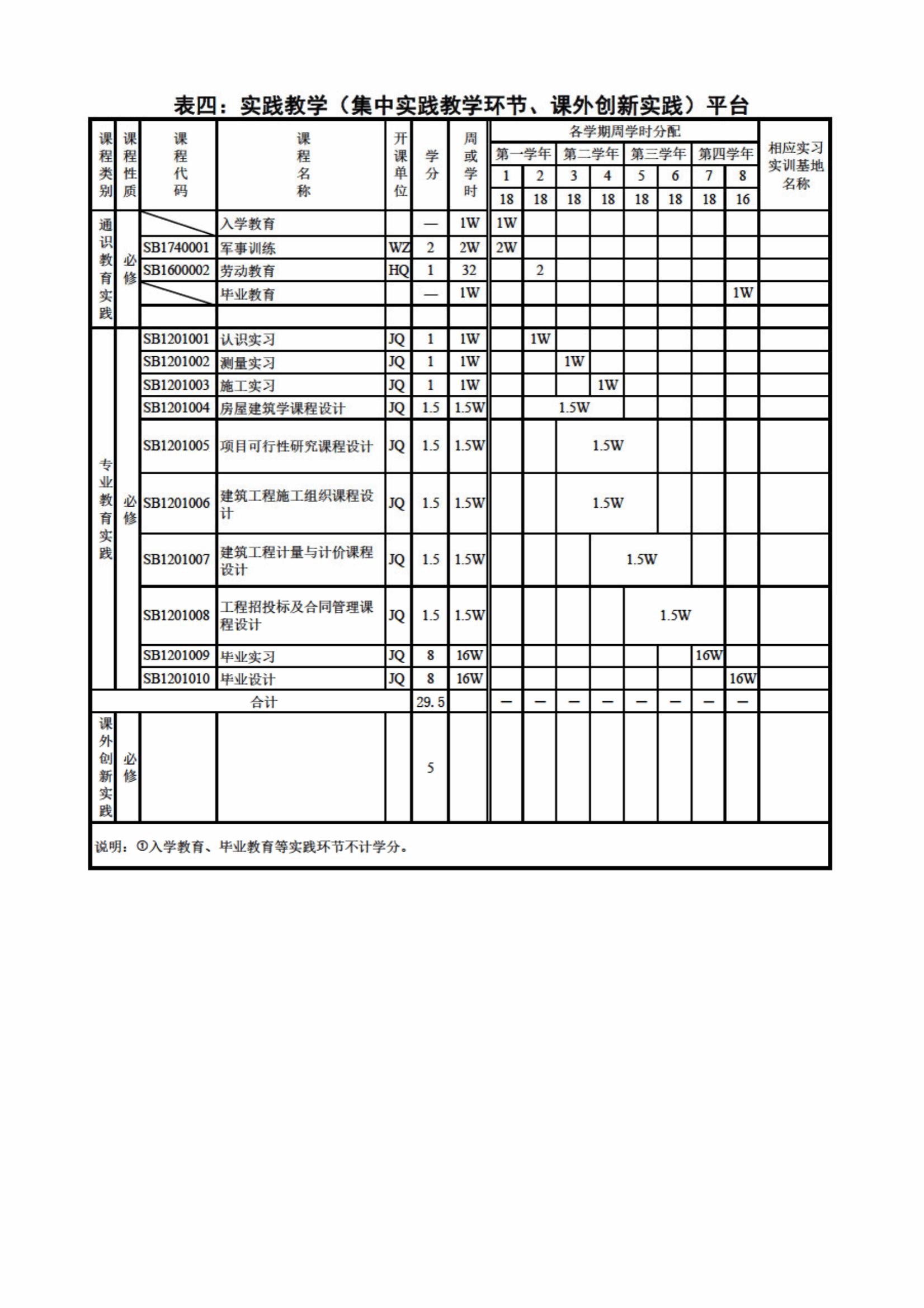 3.培养目标:本专业贯彻党的教育方针,落实立德树人根本任务,坚持用核心价值观涵养大学生;树立“学生中心、产出导向、持续改进”办学理念,秉承“实基础、宽口径、强能力、重实践”培养定位,培养德智体美劳全面发展的社会主义建设者和接班人。学生毕业时需掌握土木工程建设领域的专业知识以及管理学、经济学、法律法规等多门交叉学科相应的基础理论和基本技能,具有良好的实践能力和创新精神、终身持续学习的良好习惯等,并能依托建筑信息模型(BIM)等现代化信息技术管理手段,在工程建设领域的企事业单位、相关政府部门从事建设项目全过程管理中的投资决策、勘察设计、施工及监理(项目管理)、造价咨询、工程审计等方面管理工作的高素质应用型人才。