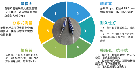 光纤光栅传感优点:(1)抗电磁干扰:电磁辐射频率比光波低许多,光纤中传输的光信号不受电磁干扰影响;(2)耐腐蚀,化学性能稳定:制作光纤的材料一石英具有极高的化学稳定性,光纤传感器适用于恶劣环境;(3)传输及熔接损耗小:传输损耗约0.25dB/km,熔接损耗约0.2dB/点,适合远距离监测;(4)体积小、重量轻:适用特殊场合,便于与基材耦合成智能材料;(5)传输容量大:可实现多点分布式测量,单根光纤最大可串接20个光栅传感器;(6)电绝缘性能好:光纤由电介质构成,且无需电源驱动,适宜于在易燃易爆的环境中使用(图8)。