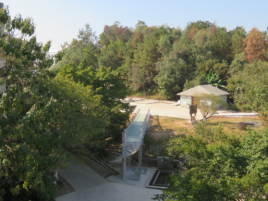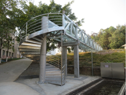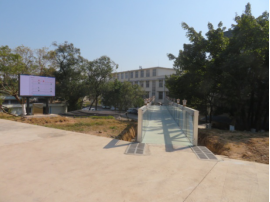我院装配式智慧健康监测试验平台于2019年11月28日建成投入使用,主要包括装配式试验平台和智慧健康监测系统。装配式试验平台(图1)为预应力装配式简支铝桁梁桥,由主桁梁和横梁组成,主桁梁3米一个节段进行预制拼装而成。桥长22.54米,宽1.92米,高1.66米,采用钢化玻璃桥面和玻璃挡板,桥梁两侧安装景观灯供夜间照明,搭配装配式旋转楼梯(图2)。智慧健康监测系统(图3)由光纤光栅传感器、24通道光纤光栅解调设备、监测软件组成。通过105英寸LED显示屏(图4)实时显示软件数据及图表等。该试验平台充分体现快速装配化的特点,同时对结构使用状态下受力变化进行智慧化实时监测。
